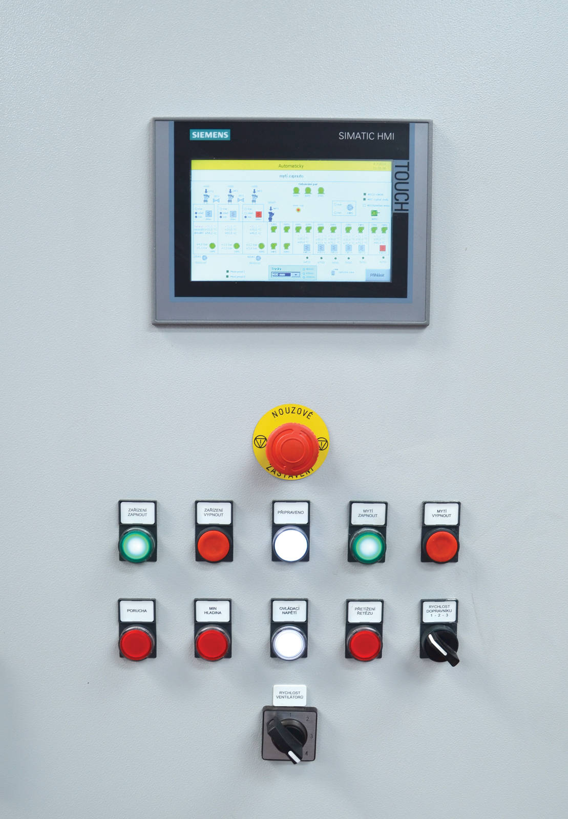 Control and operation of the washing line is provided with the processor control with visualization of the operation parameters on screen. The switchboard with touch screen and control buttons is located at the input to the equipment, so the operator is informed about the entire process of the equipment. The system is automatically switched off when the line is overloaded or any other irregularity appears in the selected process of washing and drying, and the operator is informed.