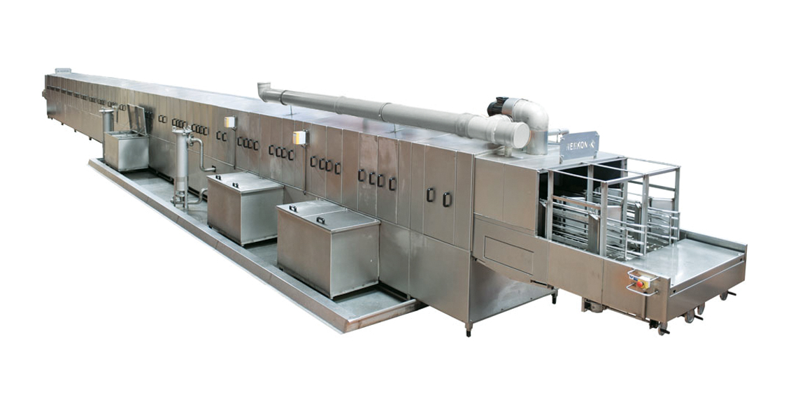 PROGRESS 702 - 400Myčka přepravek a obalů - Modulární dvoustopé průběžné mycí zařízení s průchozí výškou 400 mm pro obě stopy a přestavitelným bočním vedením umožňující kombinované mytí obalů různých rozměrů v jednom stroji. |