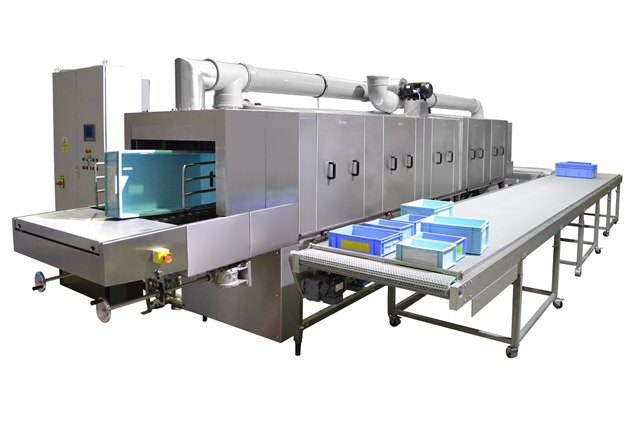 PROGRESS 501- 1000Myčka přepravek a obalů - Modulární jednostopé průběžné mycí zařízení s průchozí výškou 1000 mm a přestavitelným bočním vedením umožňující kombinované mytí obalů různých rozměrů v jednom stroji. |