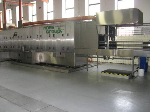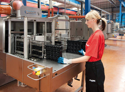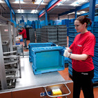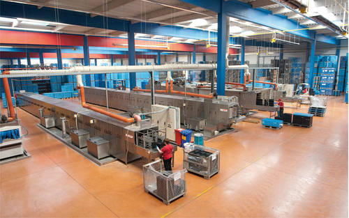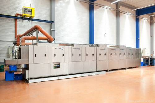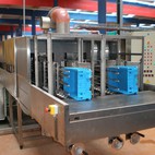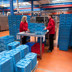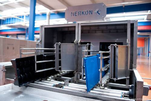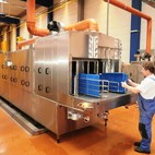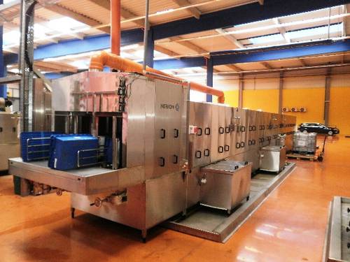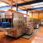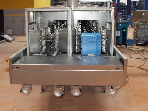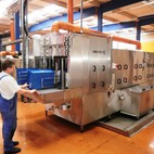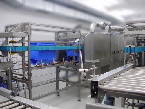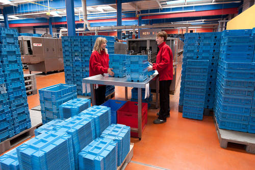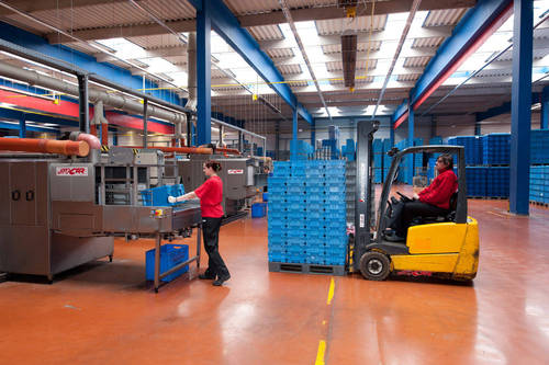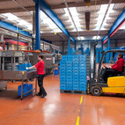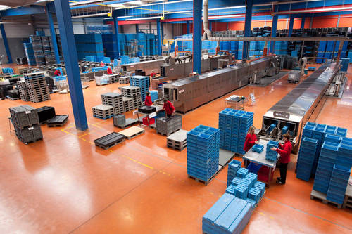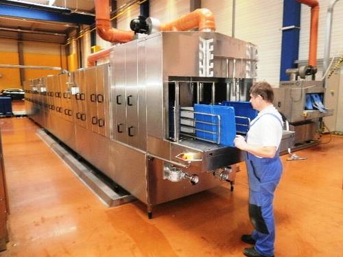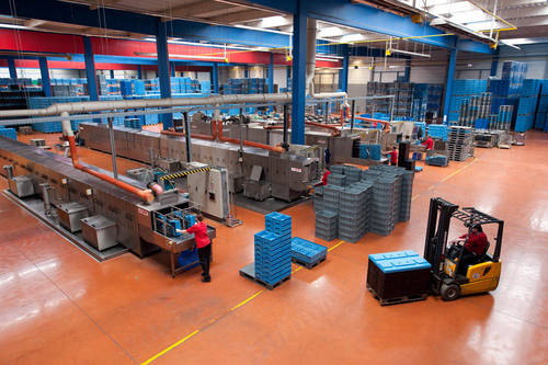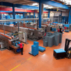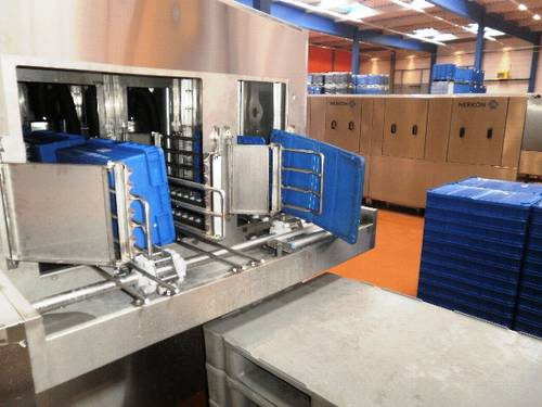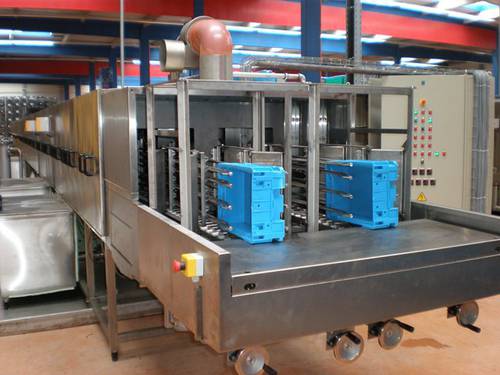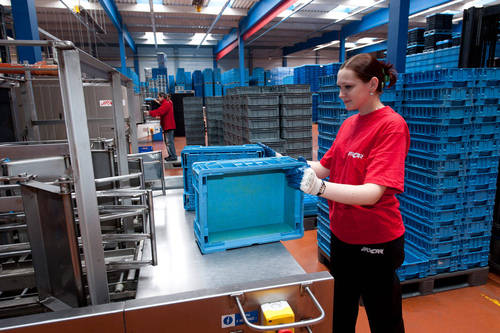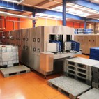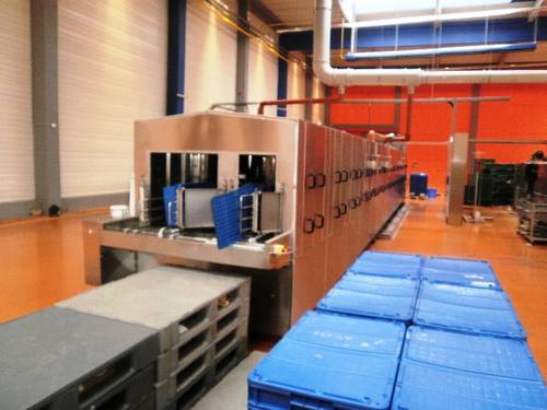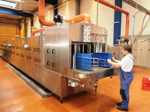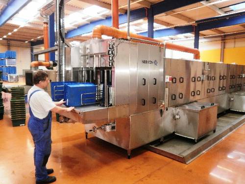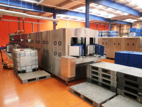 Fotografie z použití mycího zařízení PROGRESS v logistickém depu, kde se čistí obaly pro automobilový průmysl, jako jsou KLT přepravky, palety, blistry a víka.