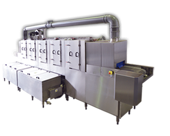 Mytí a odmašťování vyráběných dílů na vodní bázi postřikovou technologií v tunelových pračkách.